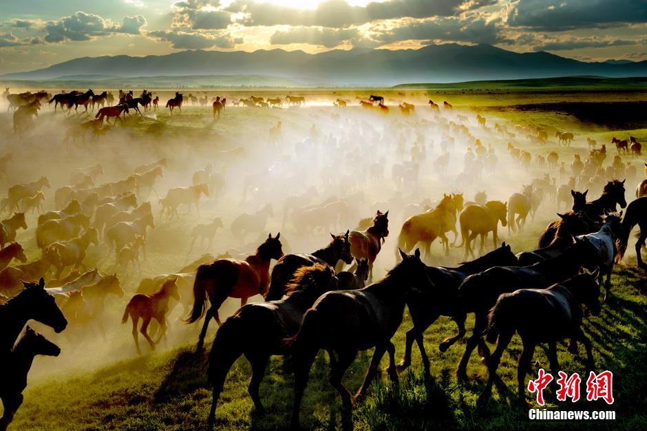 Known as the "hometown of Ili horse", the Kunes prairie of northwest China's Xinjiang Uygur Autonomous Region enters wet season in June. Thousands of Ili horse gallop and play at this vast grassland. The fast, strong and handsome Ili horse is also called the "heavenly horse". (Chinanews/Dang Wenting)