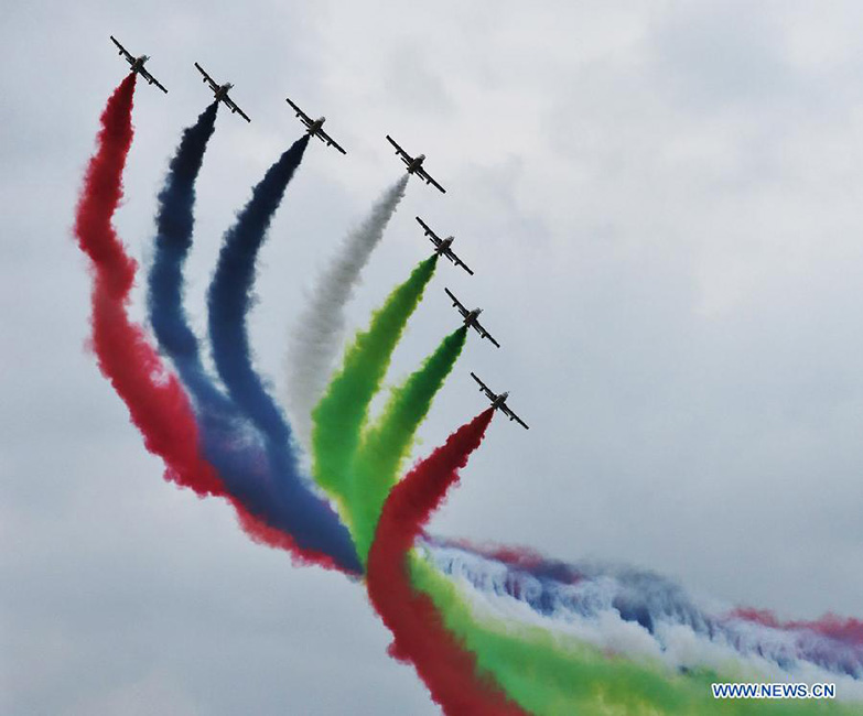 The UAE Aerobatic Display Team "Knights" perform during a military show to celebrate the 43rd anniversary of the founding of the United Arab Emirates (UAE) in Abu Dhabi, capital of the UAE, on Dec. 1, 2014. The UAE greets its national foundation day on Dec. 2 annualy. (Xinhua/An Jiang)