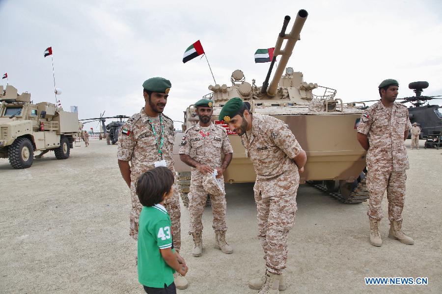 A service man talks with a child during a military show to celebrate the 43rd anniversary of the founding of the United Arab Emirates (UAE) in Abu Dhabi, capital of the UAE, on Dec. 1, 2014. The UAE greets its national foundation day on Dec. 2 annualy. (Xinhua/An Jiang)