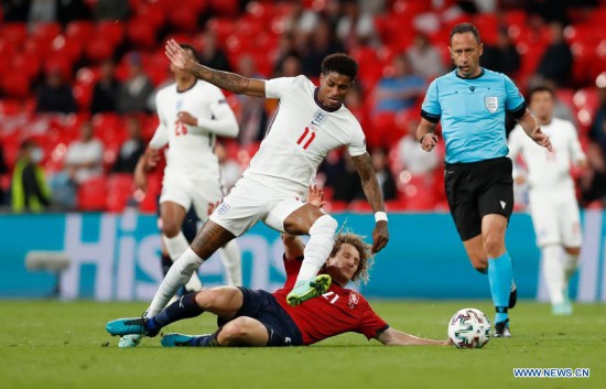 England's Marcus Rashford (up) vies with Czech Republic's Alex Kral during the Group D match between England and the Czech Republic at the UEFA EURO 2020 in London, Britain, on June 22, 2021. (Xinhua/Han Yan)