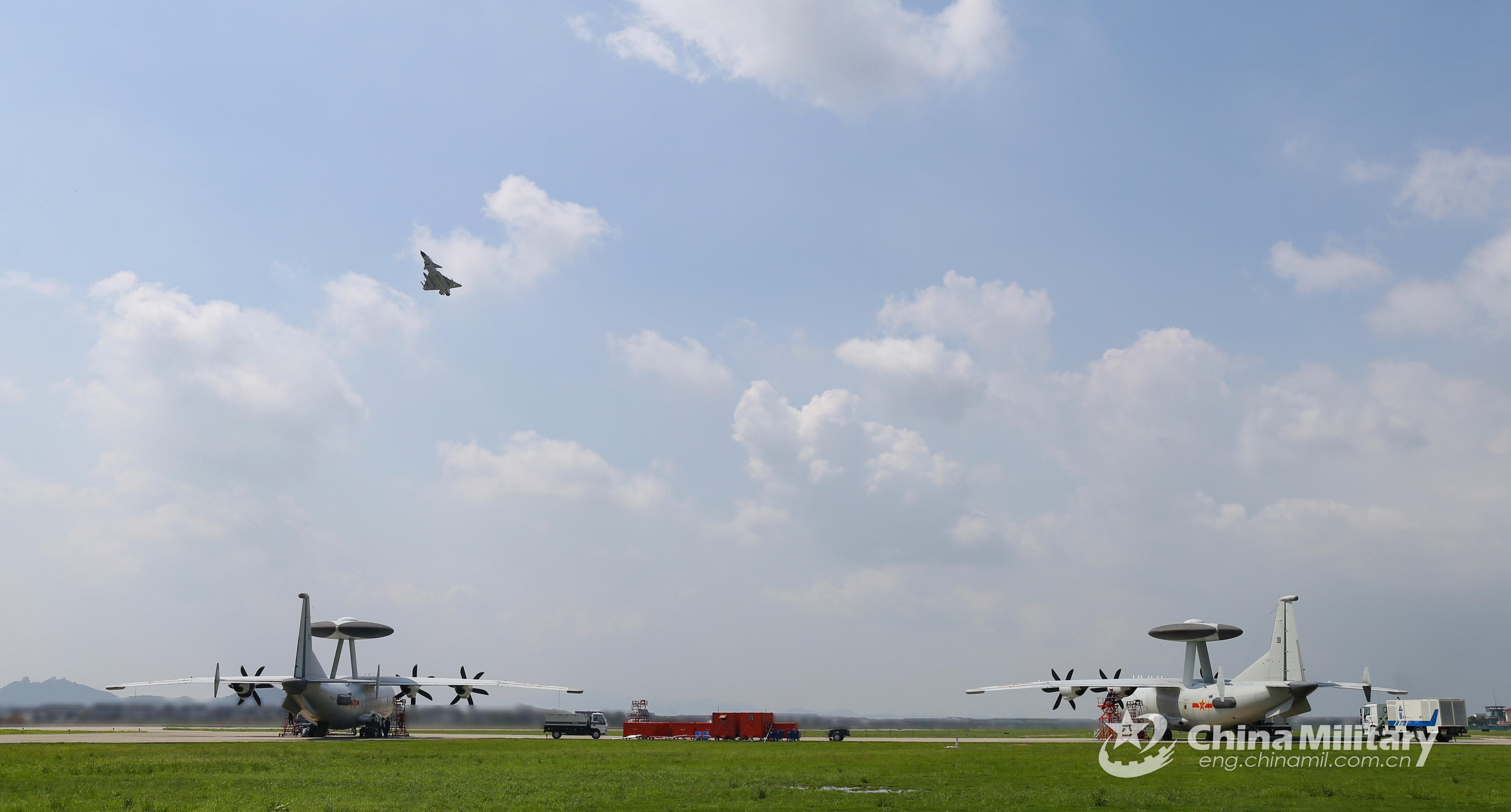 A fighter jet soars into the sky during a coordination flight training exercise conducted by the naval aviation troops under the PLA Eastern Theater Command in late August, 2021. The coordination training aimed to hone the joint combat capability of multi-type warplanes under complex conditions. (eng.chinamil.com.cn/Photo by Deng Peng)