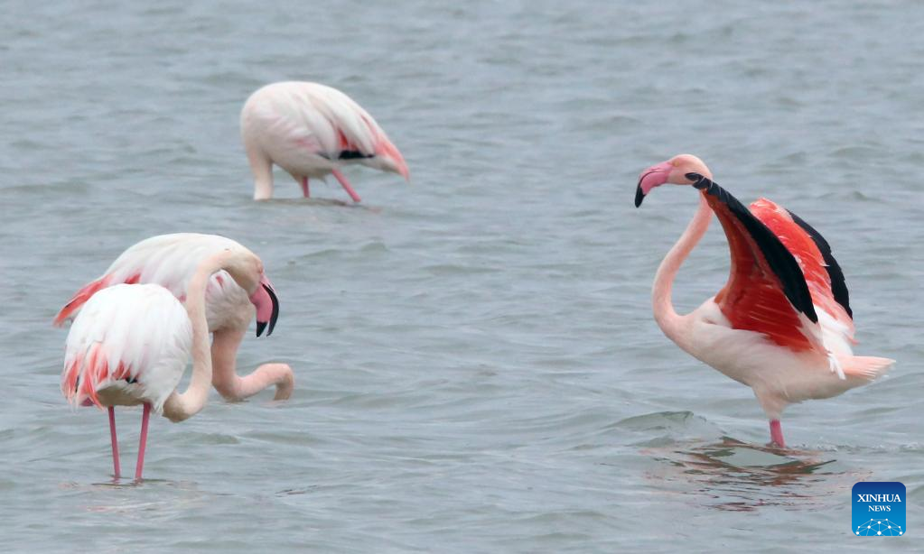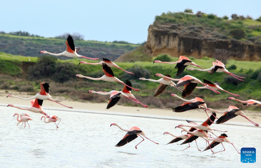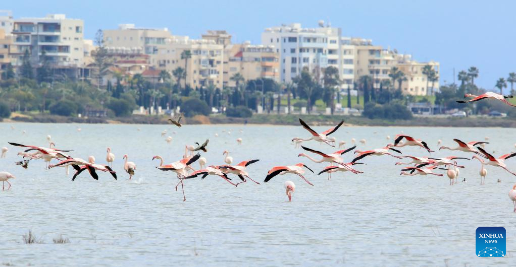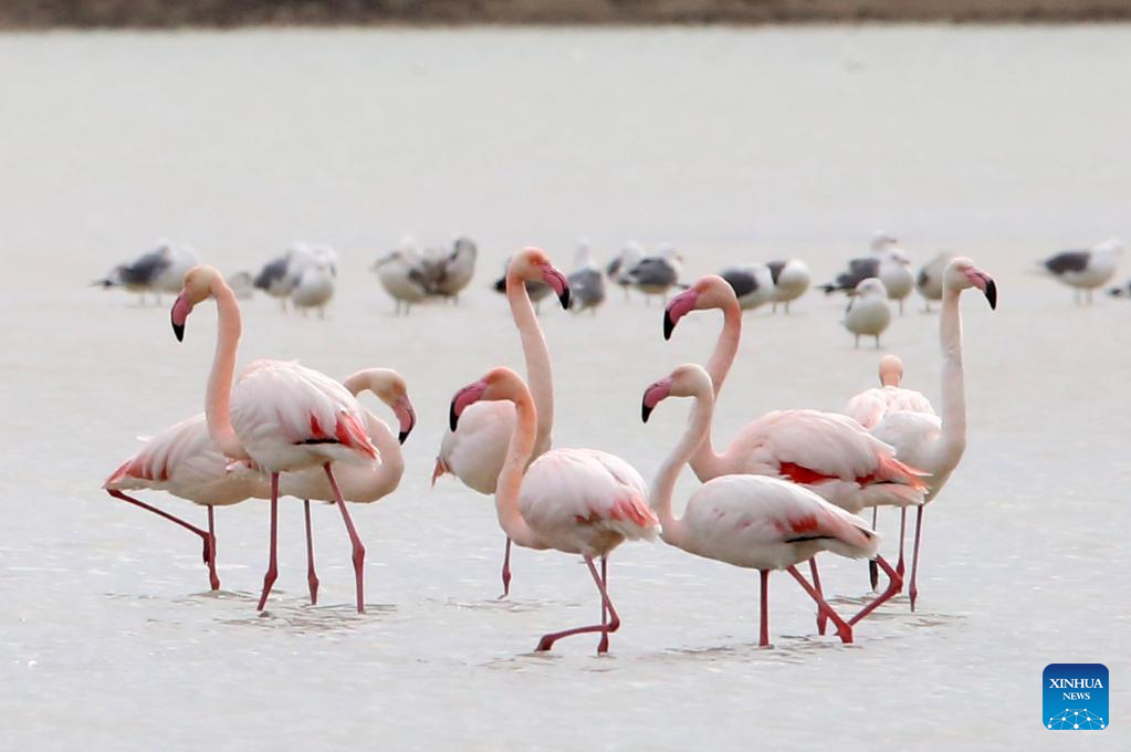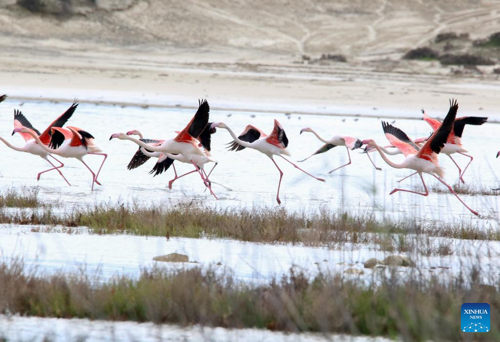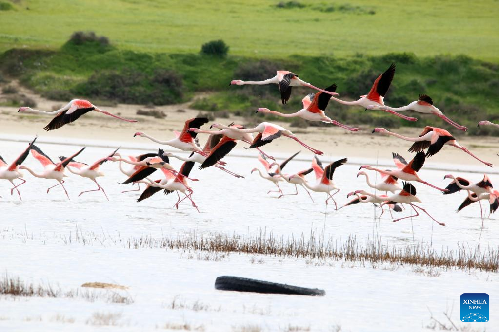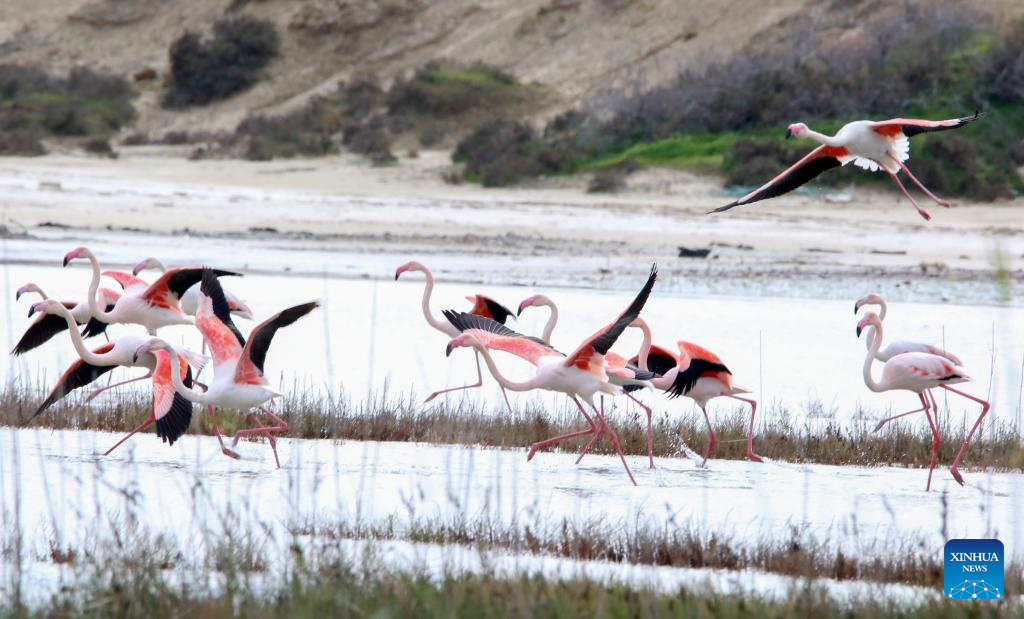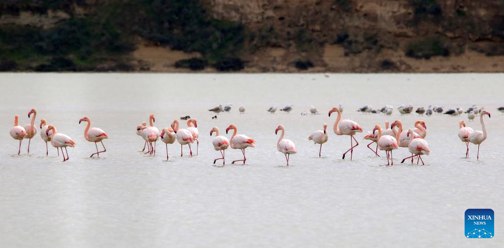 Flamingos are seen in Larnaca Salt Lake, Cyprus, Jan. 26, 2022. (Photo by George Christophorou/Xinhua)