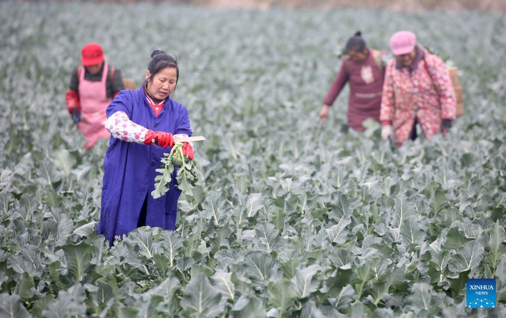 Farmers reap broccoli at an agricultural base in Wuliqiao Village of Yuping Dong Autonomous County in Tongren City, southwest China's Guizhou Province, Feb. 19, 2022. Saturday marks the day of Yushui, or Rain Water, the second of the solar terms. As Yushui arrives, the temperature will rise and rain will become frequent. Farmers across Guizhou are busy with spring agricultural production. (Photo by Liu Dejun/Xinhua)