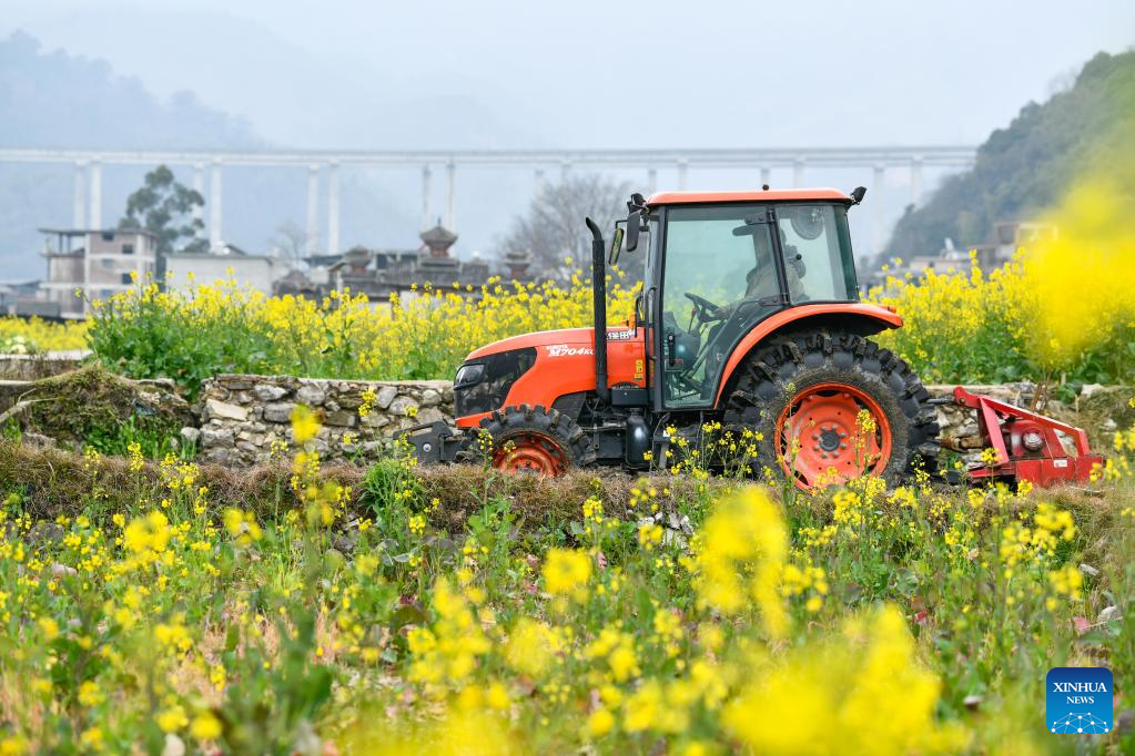 Farmers work in the field in Hexin Village of Qianxi City, southwest China's Guizhou Province, Feb. 19, 2022. Saturday marks the day of Yushui, or Rain Water, the second of the solar terms. As Yushui arrives, the temperature will rise and rain will become frequent. Farmers across Guizhou are busy with spring agricultural production. (Photo by Fan Hui/Xinhua)