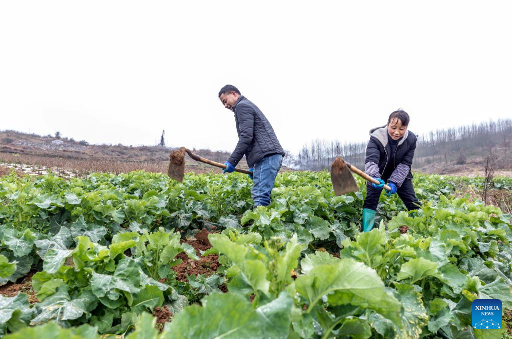 Farmers carry vegetables in the field in Shangpilin Village of Congjiang County, southwest China's Guizhou Province, Feb. 19, 2022. Saturday marks the day of Yushui, or Rain Water, the second of the solar terms. As Yushui arrives, the temperature will rise and rain will become frequent. Farmers across Guizhou are busy with spring agricultural production. (Xinhua/Yang Wenbin)