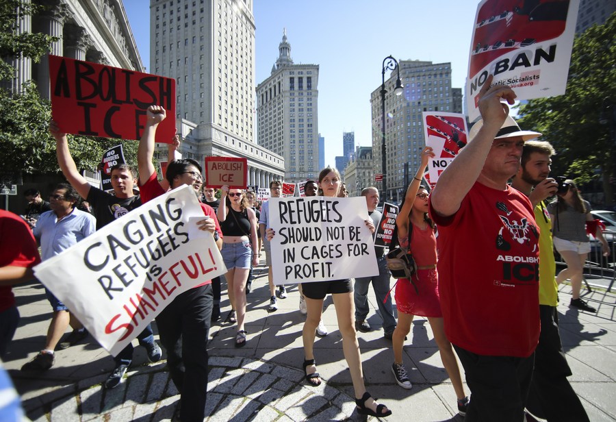People take part in the "March to Abolish ICE" protest in New York, the United States, June 29, 2018. (Xinhua/Wang Ying)