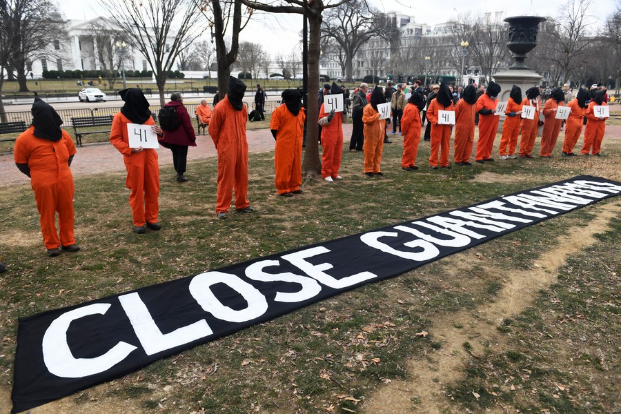 Protesters dressed as detainees of the Guantanamo Bay detention camp rally to demand the closing of the Guantanamo Bay detention camp outside the White House in Washington D.C., the United States, on Jan. 11, 2018. (Xinhua/Yin Bogu)