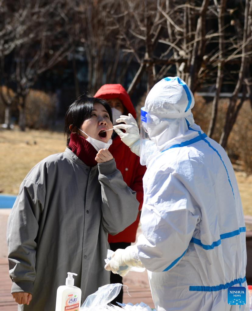 A medical worker takes a swab sample from a resident for nucleic acid test at a COVID-19 testing site in Changchun, northeast China's Jilin Province, March 30, 2022. (Xinhua/Zhang Jian)