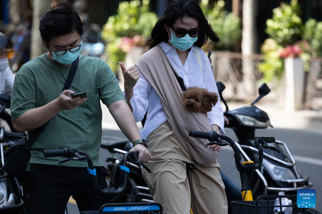 A woman holding her pet rides a bike in Xuhui District of Shanghai, east China, May 31, 2022. (Xinhua/Jin Liwang)