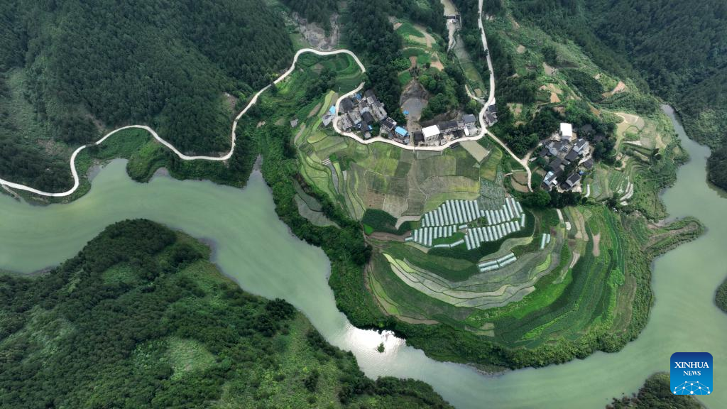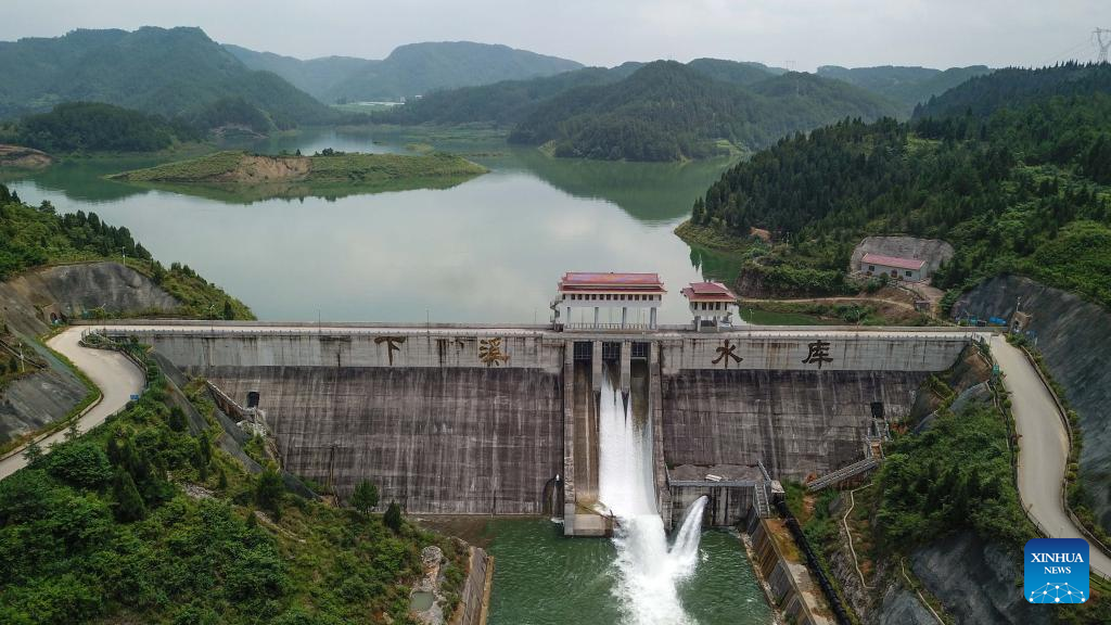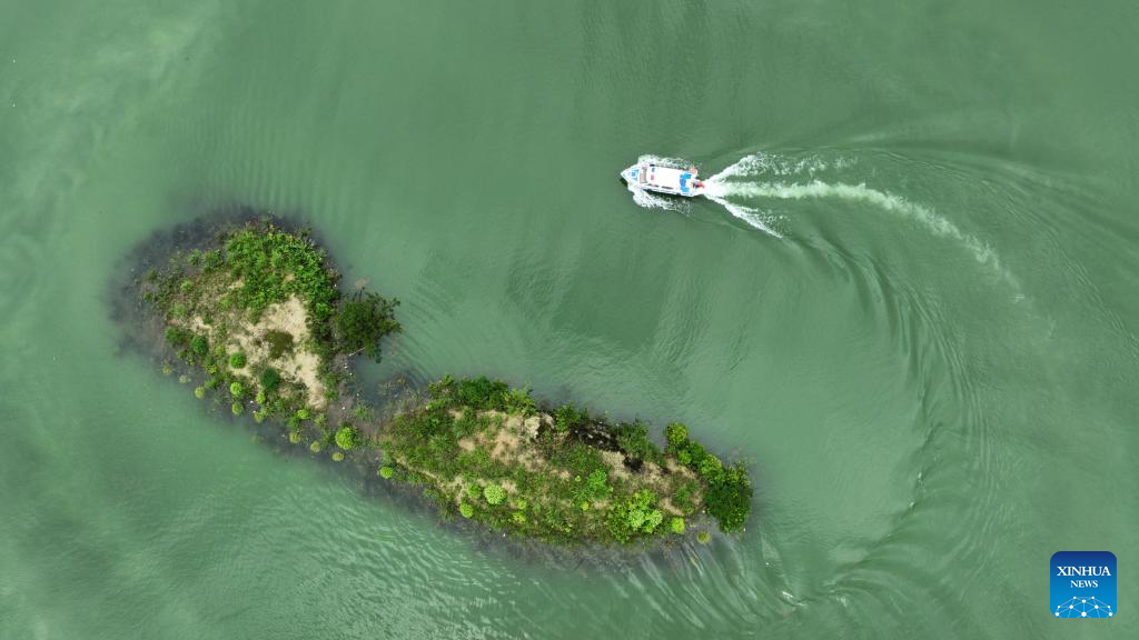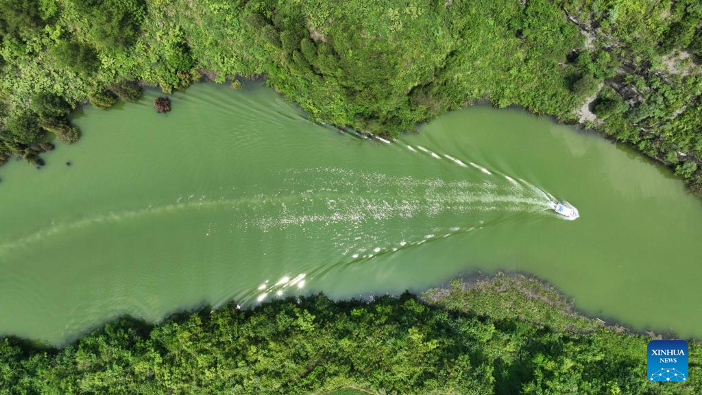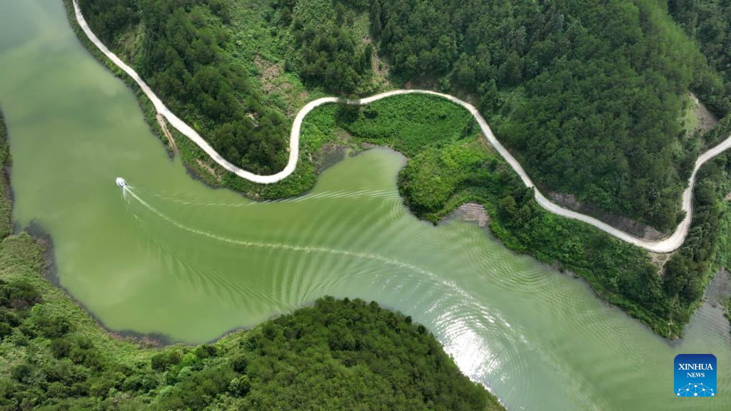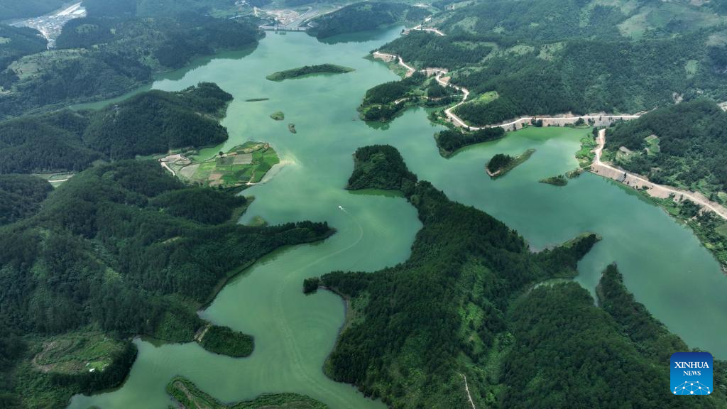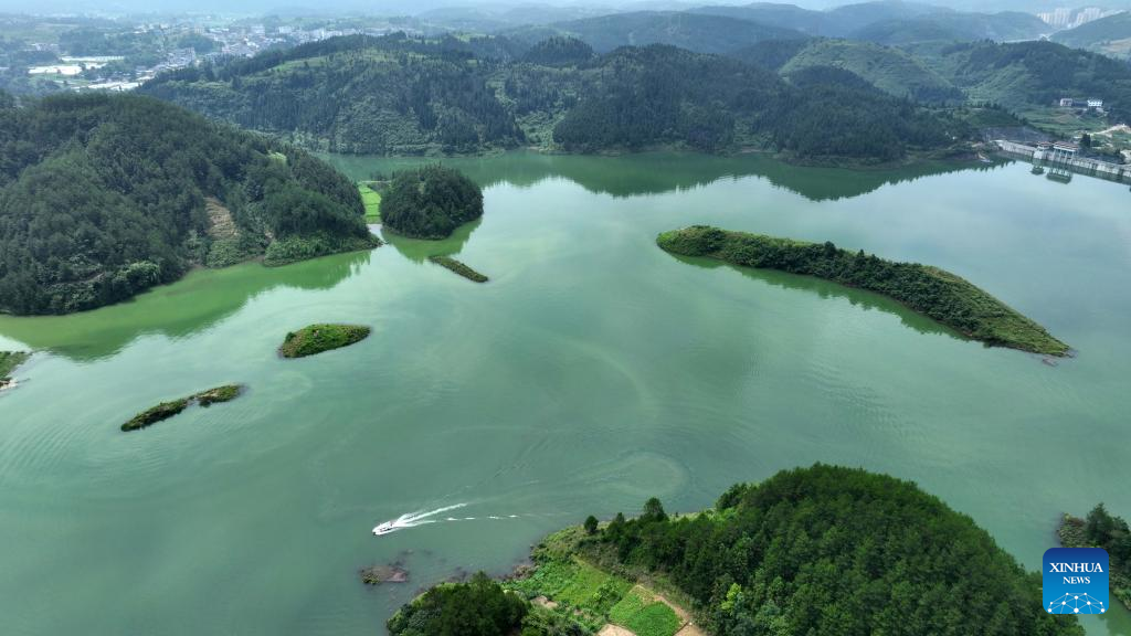Aerial photo taken on June 21, 2022 shows the view of Xiaxi Reservoir in Cengong County, Qiandongnan Miao and Dong Autonomous Prefecture, southwest China's Guizhou Province. (Xinhua/Yang Ying)