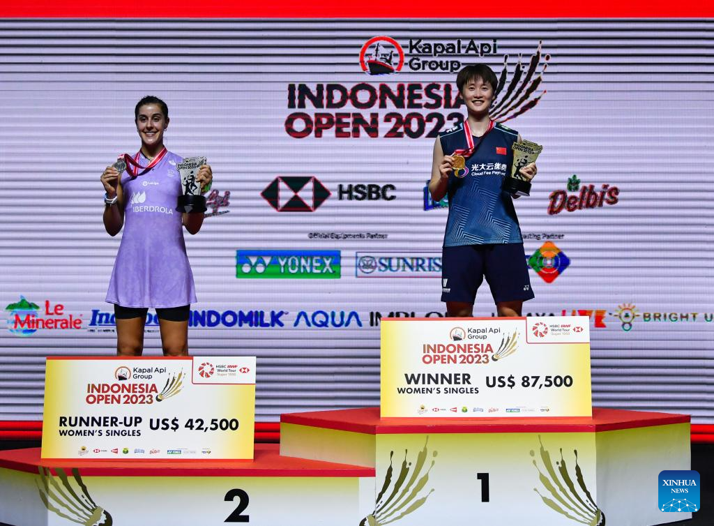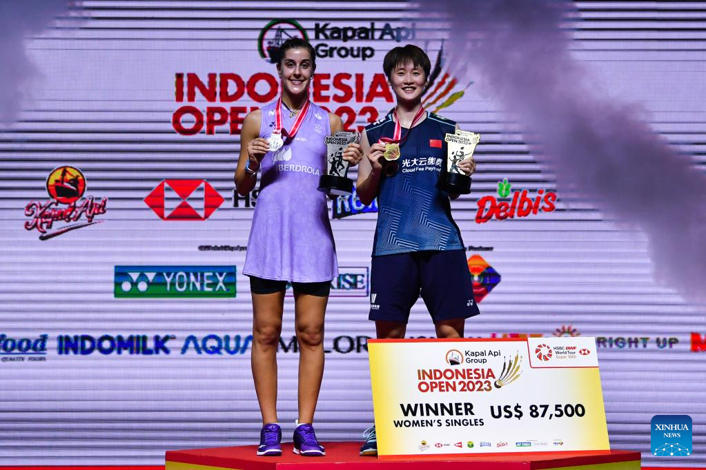 Gold medalist Chen Yufei (R) of China and silver medalist Carolina Marin of Spain pose during the awarding ceremony for the women's singles final at 2023 Indonesia Open badminton tournament in Jakarta, Indonesia, June 18, 2023. (Xinhua/Xu Qin)