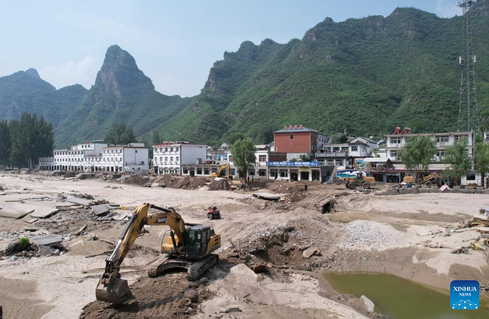 This aerial photo taken on Aug. 9, 2023 shows workers operating machinery to repair a road leading to Shannan Village of Jiulong Town, Laishui County, north China's Hebei Province. Some roads blocked by the rain-triggered floods in the county are repaired, and electricity and communication services are restored. (Xinhua/Yang Shiyao)