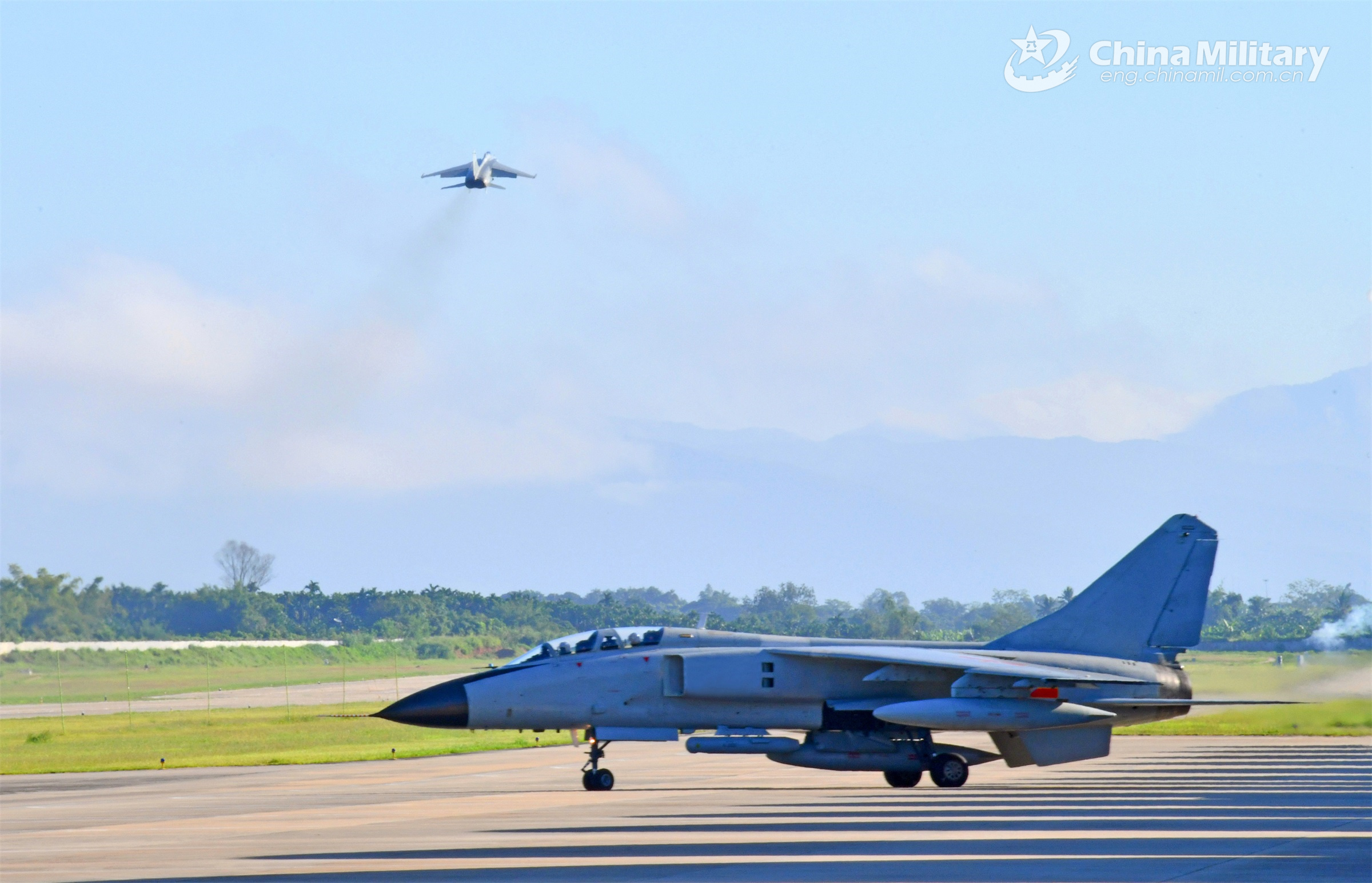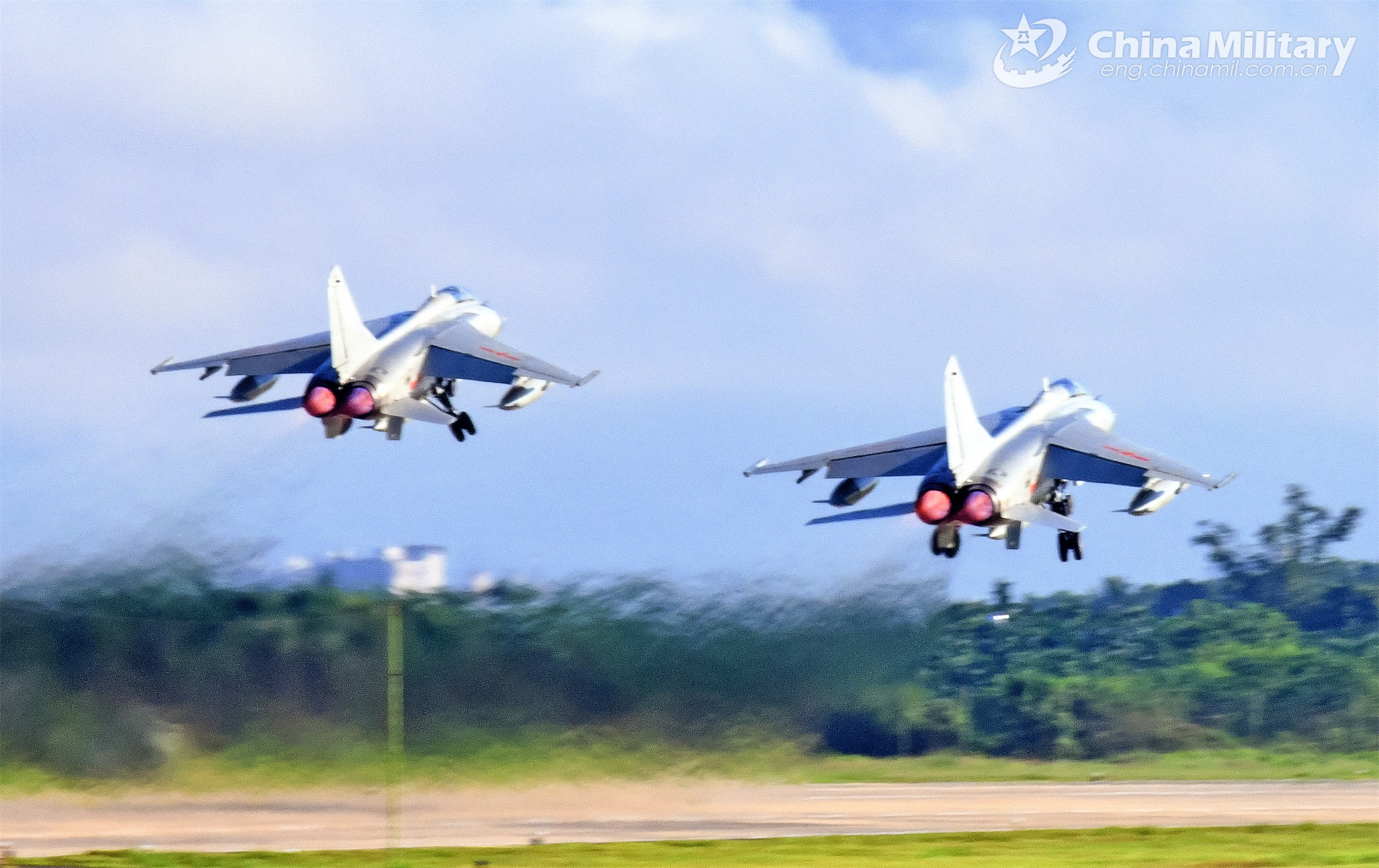 Two fighter jets attached to an aviation brigade with the air force under the PLA Southern Theater Command take off in the multi-subject flight training on September 20, 2023. (eng.chinamil.com.cn/Photo by Zhuo Lingpeng)