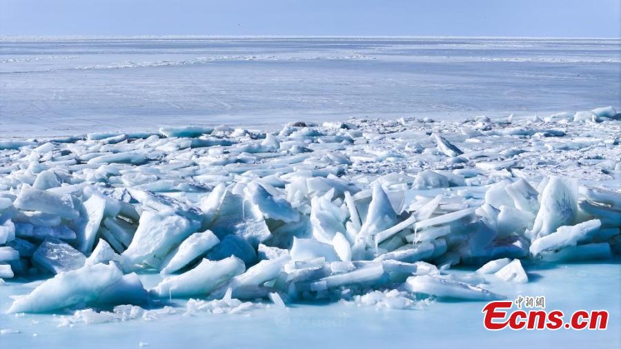 Chunks of blue ice pile up on Qinghai Lake, China's largest inland saltwater lake in Hainan Tibetan Autonomous Prefecture, northwest China's Qinghai Province, Feb. 13, 2025. (China News Service/Xue Di)
