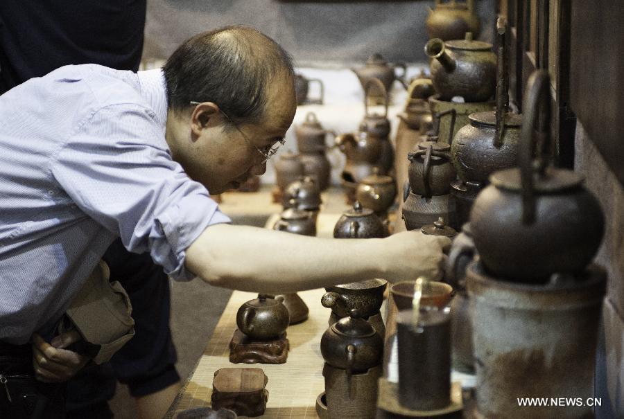 A visitor chooses tea sets during the 10th China Yunnan Pu'er Tea Expo in Kunming, capital of southwest China's Yunnan Province, May 15, 2015. The four-day tea expo, kicked off in Kunming on Friday, attracting over 400 tea companies. (Xinhua/Lyu Shuai)