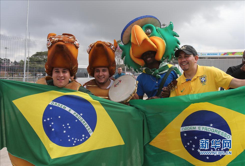 Soccer fans dressed up to pose for photos outside the stadium in Sao Paulo,on Jun 11,2014.(Xinhua/Sao Paolo agency)