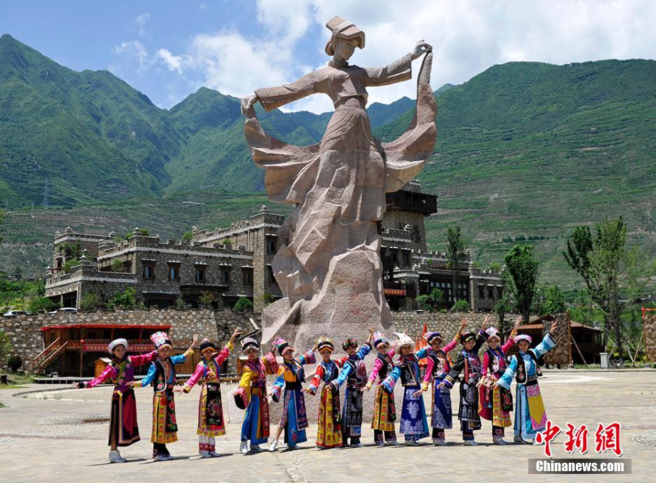 | On July 12, 2014, the national fitness team members dressed in the traditional costumes of Qiang girls show both traditional and modern beauty in the run-up to Hong Kong Federation of Bodybuilding and Fitness (HKFBF) International Bodybuilding and Fitness Invitation Championship. (Chinanews.com/ An Yuan) |