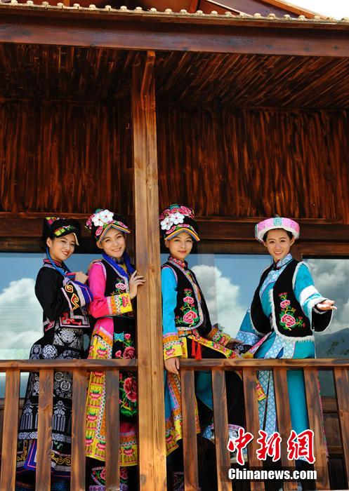 On July 12, 2014, the national fitness team members dressed in the traditional costumes of Qiang girls show both traditional and modern beauty in the run-up to Hong Kong Federation of Bodybuilding and Fitness (HKFBF) International Bodybuilding and Fitness Invitation Championship. (Chinanews.com/ An Yuan)
