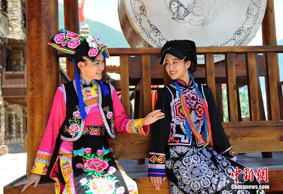 On July 12, 2014, the national fitness team members dressed in the traditional costumes of Qiang girls show both traditional and modern beauty in the run-up to Hong Kong Federation of Bodybuilding and Fitness (HKFBF) International Bodybuilding and Fitness Invitation Championship. (Chinanews.com/ An Yuan)