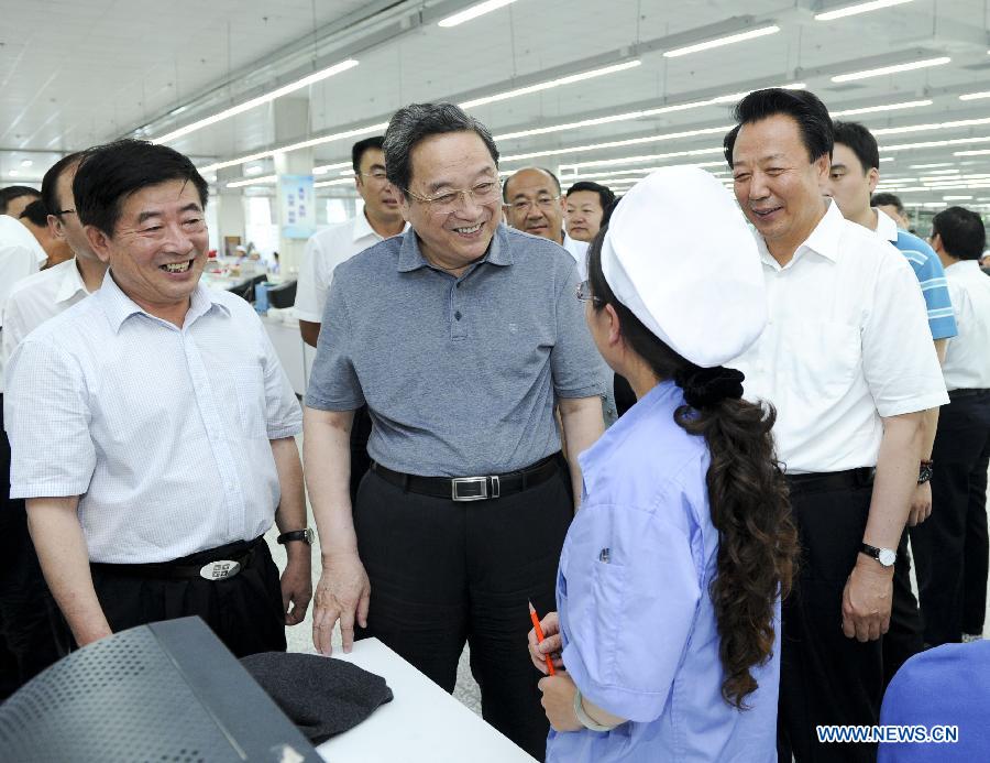 Yu Zhengsheng (2nd L, front), chairman of the National Committee of the Chinese People's Political Consultative Conference (CPPCC), talks with a worker as he visits Erdos Cashmere Group in Erdos, north China's Inner Mongolia Autonomous Region, July 18, 2014. Yu made an inspection tour in Inner Mongolia from July 18 to 21. (Xinhua/Zhang Duo)