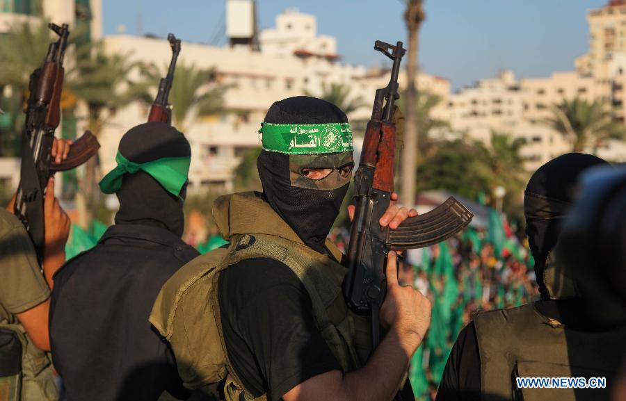 Fighters of the Ezzedine al-Qassam Brigades, a Hamas armed wing, takes part in a rally in Gaza City on Aug. 27, 2014 to celebrate an open-ended ceasefire in the Gaza Strip. The ceasefire, brokered by Egypt, was reached between the Palestinians and Israel. It came into effect at 7 p.m. local time (1600 GMT) on Tuesday. (Xinhua/Wissam Nassar)