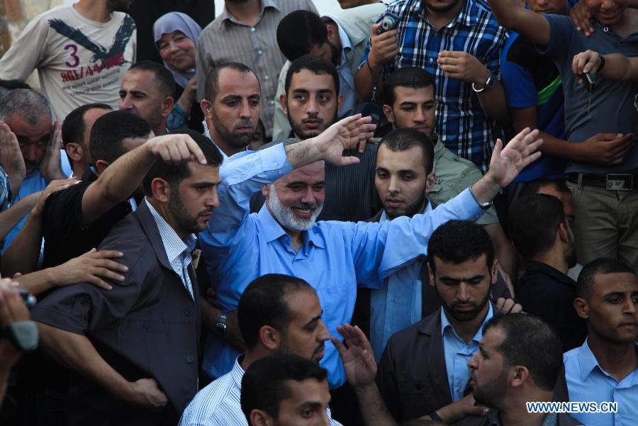 Hamas top leader in the Gaza Strip Ismail Haniya (C) waves to the crowd during a rally in Gaza City on Aug. 27, 2014 to celebrate an open-ended ceasefire in the Gaza Strip. The ceasefire, brokered by Egypt, was reached between the Palestinians and Israel. It came into effect at 7 p.m. local time (1600 GMT) on Tuesday. (Xinhua/Wissam Nassar)