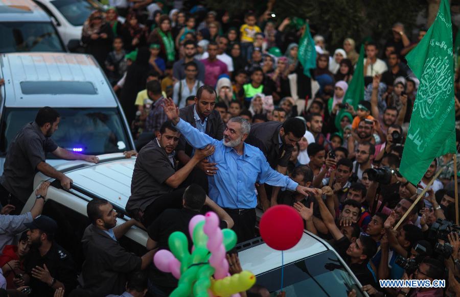 Hamas top leader in the Gaza Strip Ismail Haniya (C) waves to the crowd during a rally in Gaza City on Aug. 27, 2014 to celebrate an open-ended ceasefire in the Gaza Strip. The ceasefire, brokered by Egypt, was reached between the Palestinians and Israel. It came into effect at 7 p.m. local time (1600 GMT) on Tuesday. (Xinhua/Wissam Nassar)