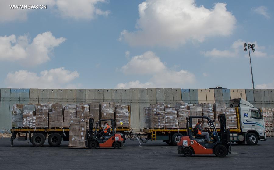 A forklift worker loads goods ready to be transported into Gaza onto a truck at Kerem Shalom crossing between Israel and Gaza, on Aug. 28, 2014. Israel fully reopened its commercial crossing with the Hamas-ruled Gaza Strip on Thursday, two days after the long-term ceasefire came into effect. Only limited humanitarian goods were allowed to enter Gaza through the Kerem Shalom crossing, the only commercial crossing in Gaza, since Operation Protective Edge began on July 8. (Xinhua/Li Rui)