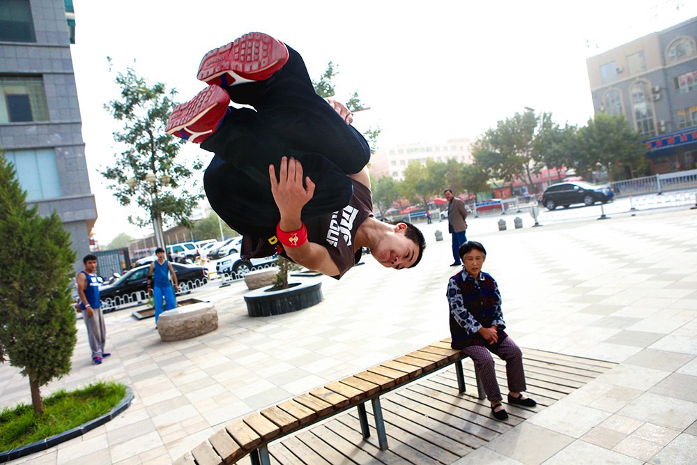 Abdusalam practices backward somersault on Sept. 25, 2014. He and his team members could not adapt to flat circumstances since they never practiced there before. Therefore, they added practices on flat areas into their trainings. (Xinhua/Wu Zhuang)