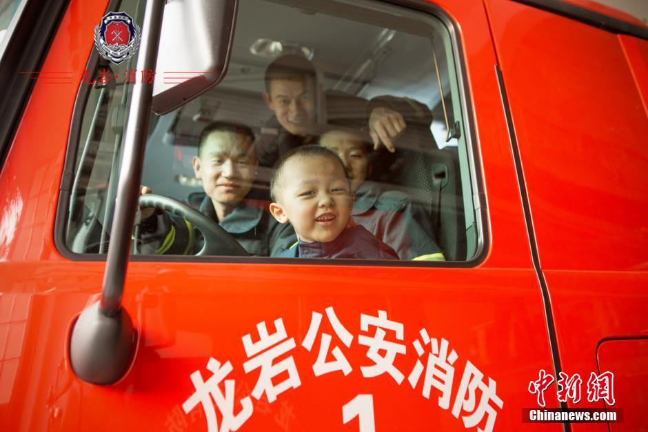 This group of photos is a birthday gift from the firefighters of Longyan Fire Department to Zhuang Yuming, who is a little fan of firefighters. In order to help Zhuang realize his dream, the firefighters decided to give him this special birthday present by making him mini firefighter uniform, and arranging a photo shoot with them in the fire department.
