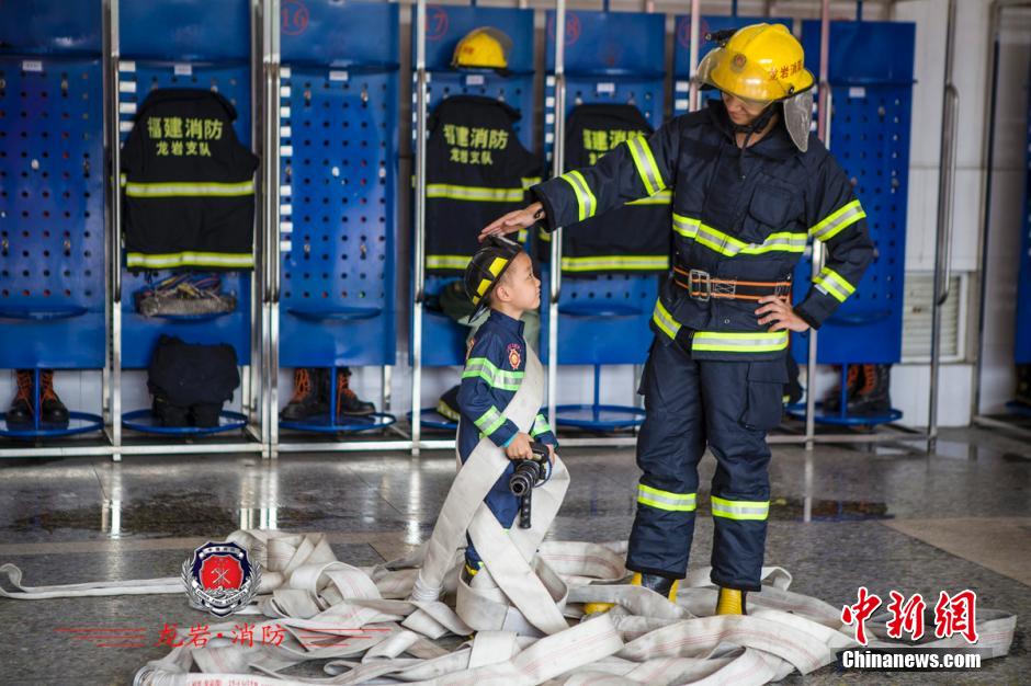 This group of photos is a birthday gift from the firefighters of Longyan Fire Department to Zhuang Yuming, who is a little fan of firefighters. In order to help Zhuang realize his dream, the firefighters decided to give him this special birthday present by making him mini firefighter uniform, and arranging a photo shoot with them in the fire department.