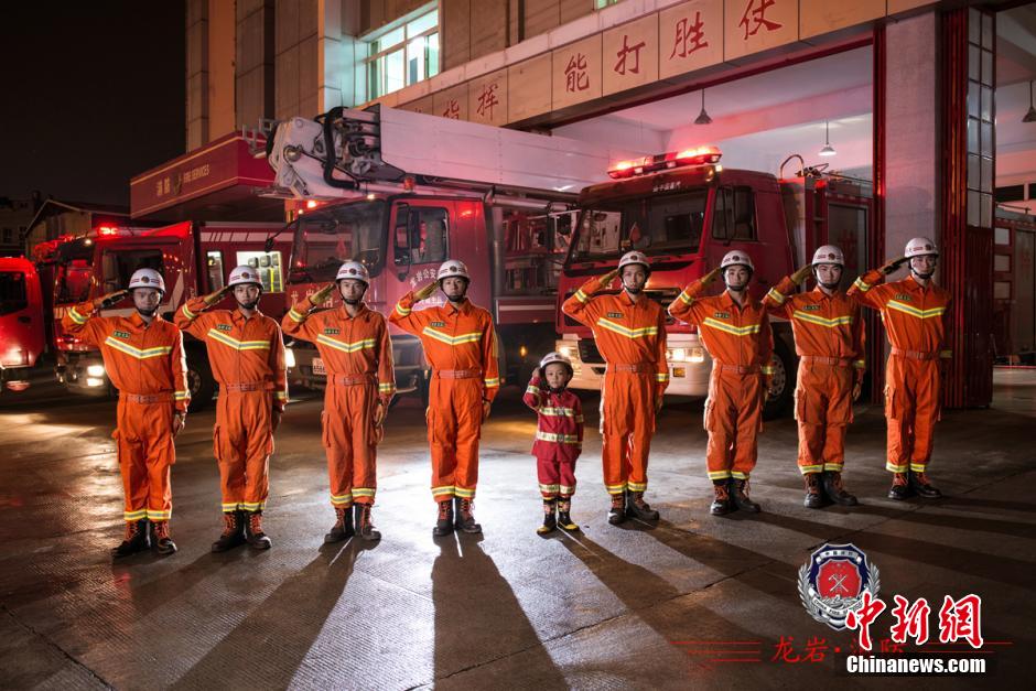 This group of photos is a birthday gift from the firefighters of Longyan Fire Department to Zhuang Yuming, who is a little fan of firefighters. In order to help Zhuang realize his dream, the firefighters decided to give him this special birthday present by making him mini firefighter uniform, and arranging a photo shoot with them in the fire department.