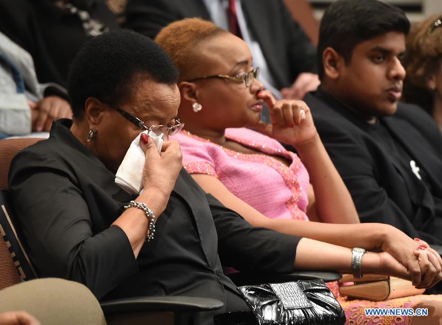Graca Machel (L), widow of late former South Africa's President Nelson Mandela, attends the opening ceremony of the Nelson Mandela Condolence Books Exhibition at the Nelson Mandela Centre of Memory of Johannesburg, South Africa, on Dec. 4, 2014. The Nelson Mandela Condolence Books Exhibition was held Thursday to mark the upcoming first anniversary of the late South Africa's President Nelson Mandela's passing which falls on Dec. 5, 2014. A total of 4850 condolence books which were brought by South Africa's embassies all over the world and more than 100 domestic condolence books are scheduled displayed during the exhibition. (Xinhua/DOC/Kopano Tlape)