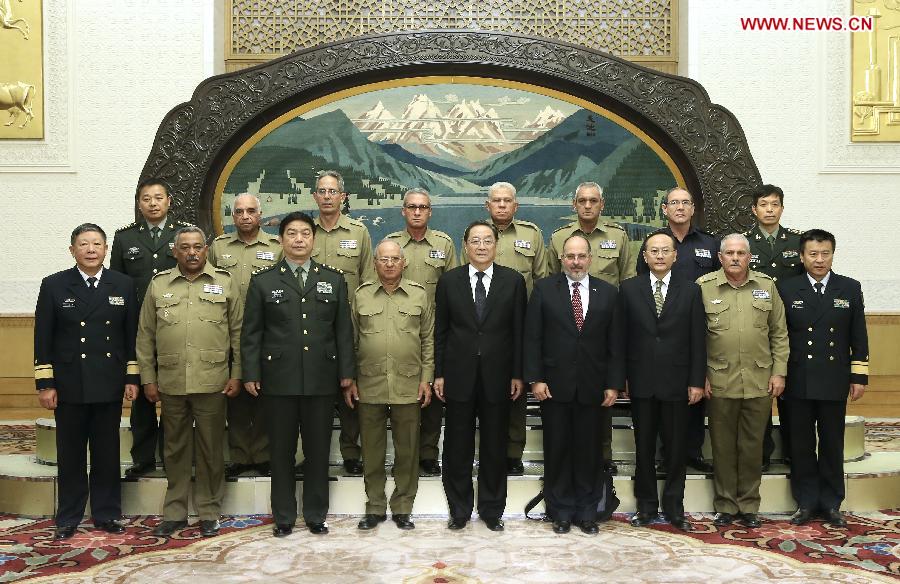 | Yu Zhengsheng (C, front), chairman of the National Committee of the Chinese People's Political Consultative Conference (CPPCC), meets with Cuban Minister of the Revolutionary Armed Forces Leopoldo Cintra Frias (4th L, front) in Beijing, capital of China, Dec. 11, 2014. (Xinhua/Pang Xinglei) |