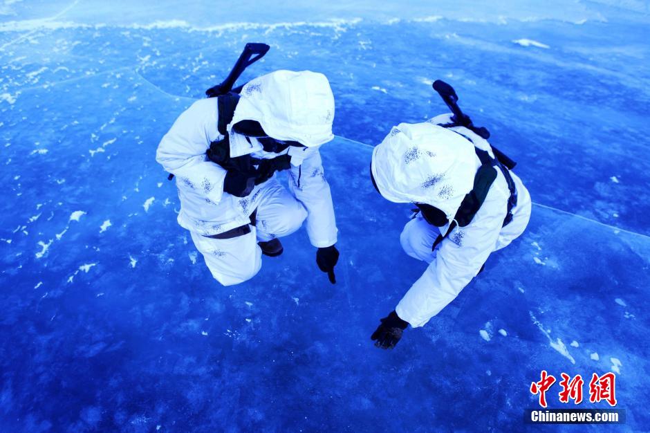 Xin Guoqiang and Zhang Bo, two sentries of the “Good Eighth Company in Heihe”, patrol at the China-Russia boundary river in severe cold of minus 32 degrees Celsius on Dec. 10, 2014. (Chinanews/Wei Jianshun)