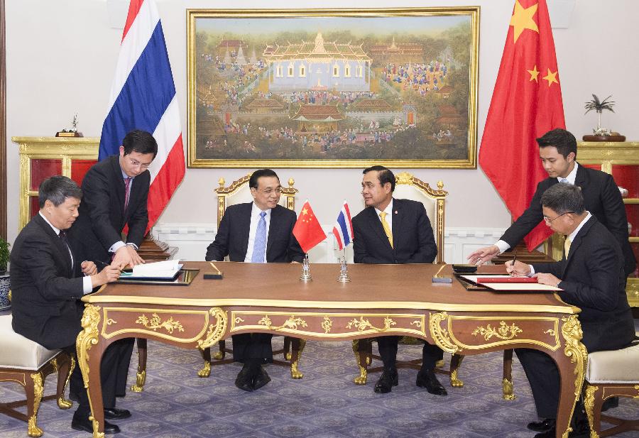 Chinese Premier Li Keqiang (center L) and Thai Prime Minister Prayuth Chan-ocha (center R) attend the signing ceremony of two memoranda of understanding on railway cooperation and farm produce trade cooperation respectively after they met in Bangkok, Thailand, Dec. 19, 2014. (Xinhua/Huang Jingwen)