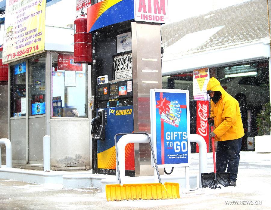 A work cleans off snow at a gas station in New York City, the United States, Jan. 26, 2015. The U.S. National Weather Service issued a blizzard warning for New York City and surrounding areas between coastal New Jersey and Connecticut, beginning 1 p.m. EST (1800 GMT) Monday and worsening overnight into Tuesday morning. (Xinhua/Qin Lang)