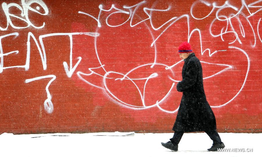 A pedestrian walks in snow in a street in New York City, the United States, Jan. 26, 2015. The U.S. National Weather Service issued a blizzard warning for New York City and surrounding areas between coastal New Jersey and Connecticut, beginning 1 p.m. EST (1800 GMT) Monday and worsening overnight into Tuesday morning. (Xinhua/Qin Lang)
