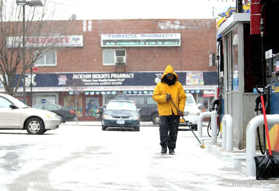 | A work cleans off snow at a gas station in New York City, the United States, Jan. 26, 2015. The U.S. National Weather Service issued a blizzard warning for New York City and surrounding areas between coastal New Jersey and Connecticut, beginning 1 p.m. EST (1800 GMT) Monday and worsening overnight into Tuesday morning. (Xinhua/Qin Lang) |