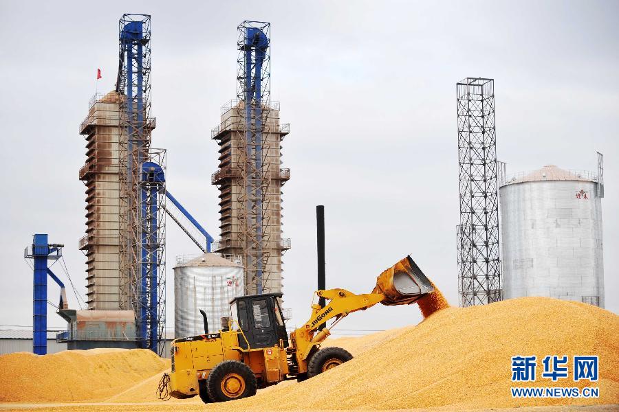On Oct. 12, 2014, a fork-lift truck carries grain in northeast China’s Heilongjiang province. (Photo/Wang Jianwei)