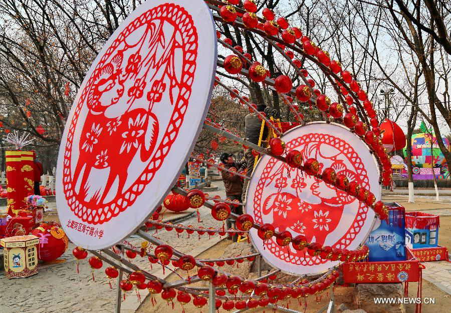 | Workers fix a lantern in a scenic spot in Beidaihe scenic area in Qinhuangdao City, north China's Hebei Province, Feb. 2, 2015. A spring festival lantern expo will be held here for 25 days starting from Feb. 10. (Xinhua/Yang Shiyao) |
