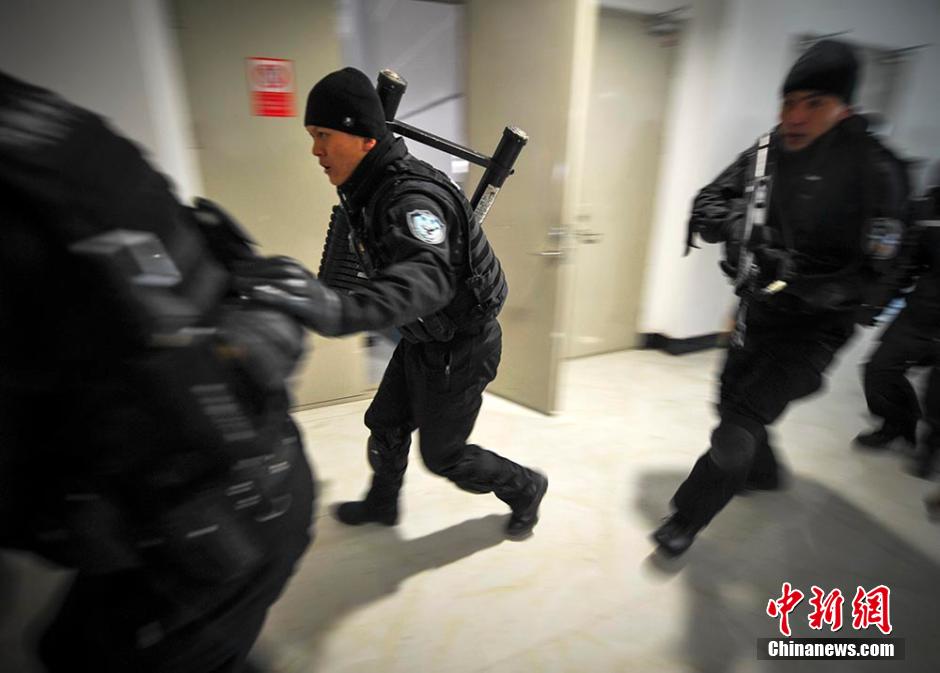 About 100 SWAT members take part in an anti-terror drill at the stadiums for the 13th National Winter Games in Urumqi, northwest China's Xinjiang Uyghur Autonomous Region on Feb. 4, 2015. The 13th National Winter Games will be held in January 2016 in Urumqi. The construction of the sports venues has already been completed. (CNS/Fang Tao)