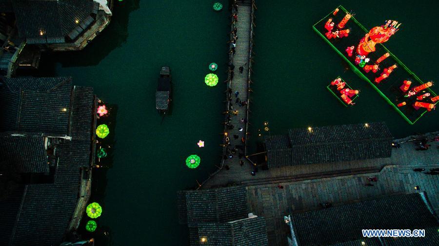 Photo taken on Feb. 6, 2015 shows the festival lanterns in Wuzhen, east China's Zhejiang Province. About twenty groups of festival lanterns were set in the town to celebrate the coming Chinese New Year, or Spring Festival, which falls this year on Feb. 19. (Xinhua/Xu Yu)