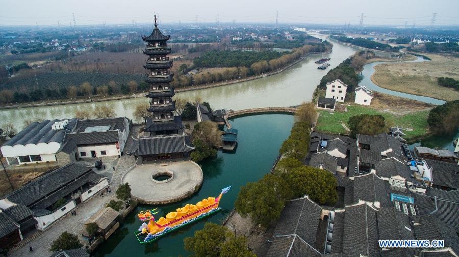 Photo taken on Feb. 6, 2015 shows the festival lanterns in Wuzhen, east China's Zhejiang Province. About twenty groups of festival lanterns were set in the town to celebrate the coming Chinese New Year, or Spring Festival, which falls this year on Feb. 19. (Xinhua/Xu Yu)