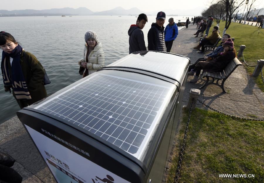 | People walk past a solar power aptitude compressing dustbin newly set in the West Lake scenic spot in Hangzhou, capital of east China's Zhejiang Province, Feb. 7, 2015. Ten suits of solar power aptitude compressing dustbins were set here on Saturday, which could automatically compress trashes thrown in. (Xinhua/Ju Huanzong) |