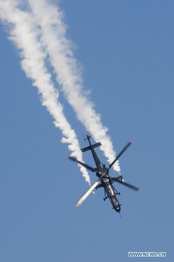 An Indian Air Force's Light Combat Helicopter flies during the inauguration of the Aero India 2015 in Air Force Station Yelahanka of Bangalore, India, Feb. 18, 2015. The biennial air show this year attracted dealers from 49 countries, showcasing their aero-related products in military and civilian fields. (Xinhua/Zheng Huansong)