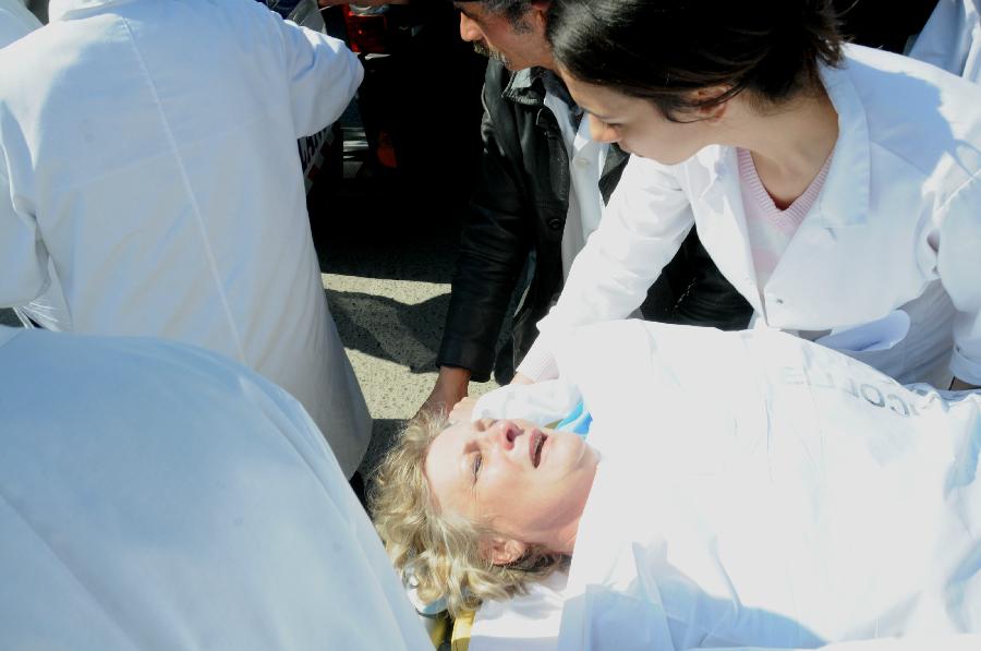 A wounded person is sent to Charles Nicole Hospital after an armed attack on Bardo Museum in Tunis on March 18, 2015. At least 19 people were killed, including 17 tourists, in the attack on Wednesday, Tunisia's Prime Minister Habib Essid said. (Xinhua/Adel)
