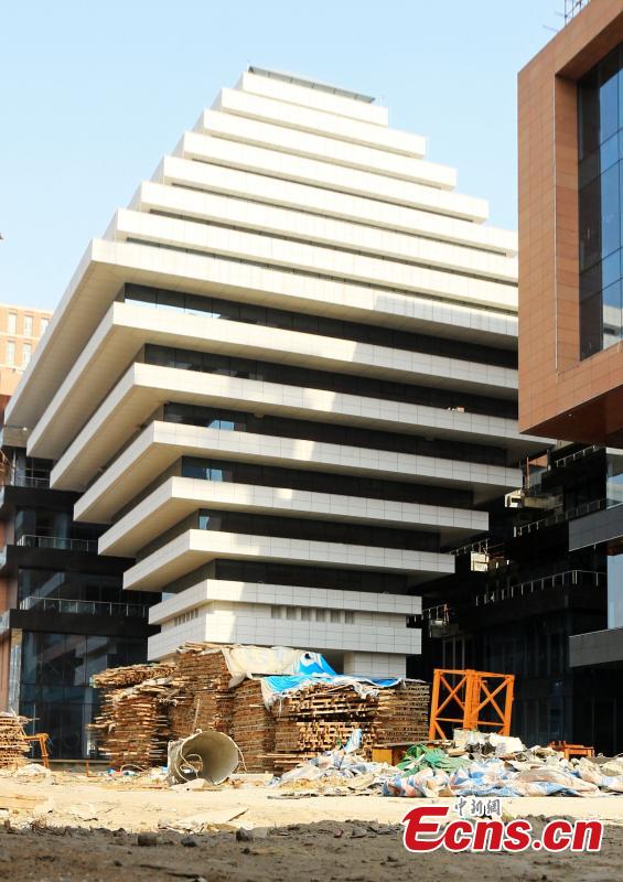 | A spinning top-shaped building is under construction in Zhengzhou, Central China's Henan province, March 29, 2015. (Photo: China News Service/Wang Zirui) |