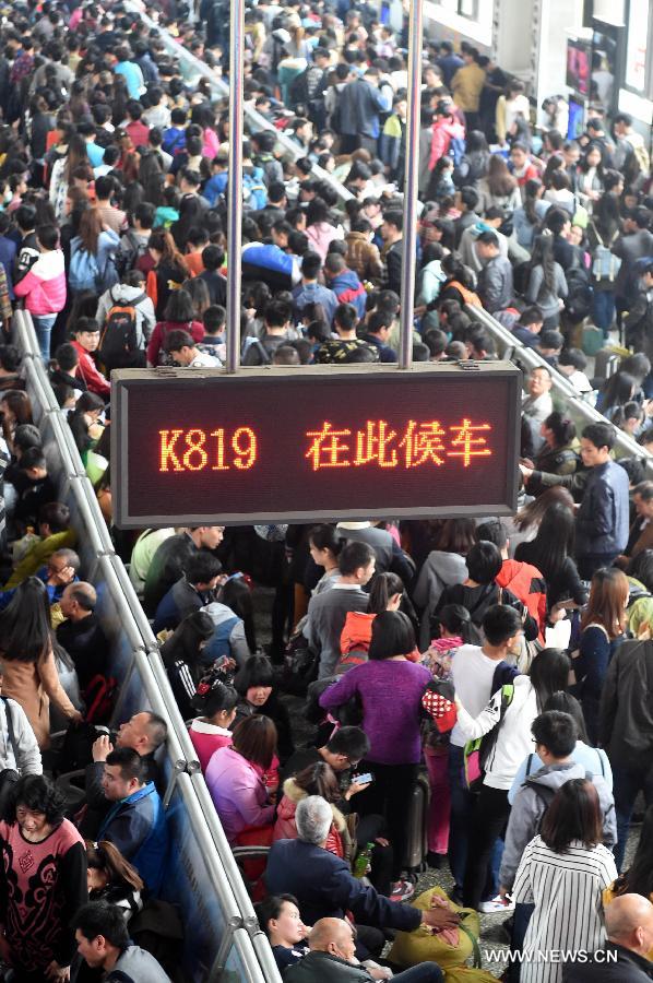 | Passengers queue to take trains at Zhengzhou Railway Station in Zhengzhou, capital city of central China's Henan Province, April 3, 2015. Zhengzhou received a travel rush during China's traditional Qingming Festival, or Tomb-sweeping Day, which falls on April 5 this year. (Xinhua/Li Bo) |
