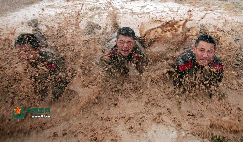 Yinchuan, northwest China's Ningxia Hui Autonomous Region, saw a moderate rain on April 1, 2015. SWAT officers there trained in mire to improve their restraint techniques and fighting skills on that day.(Photo/81.cn)